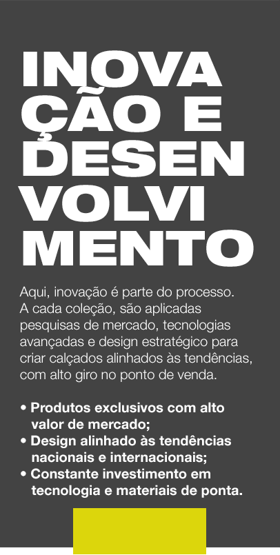 Produzimos para sua marca com todo o nosso know-how, transformando sua identidade em produtos que conquistam o mercado. Nosso diferencial está no compromisso com a excelência, inovação e confiabilidade, assegurando que cada par entregue tenha os padrões mais altos de qualidade.